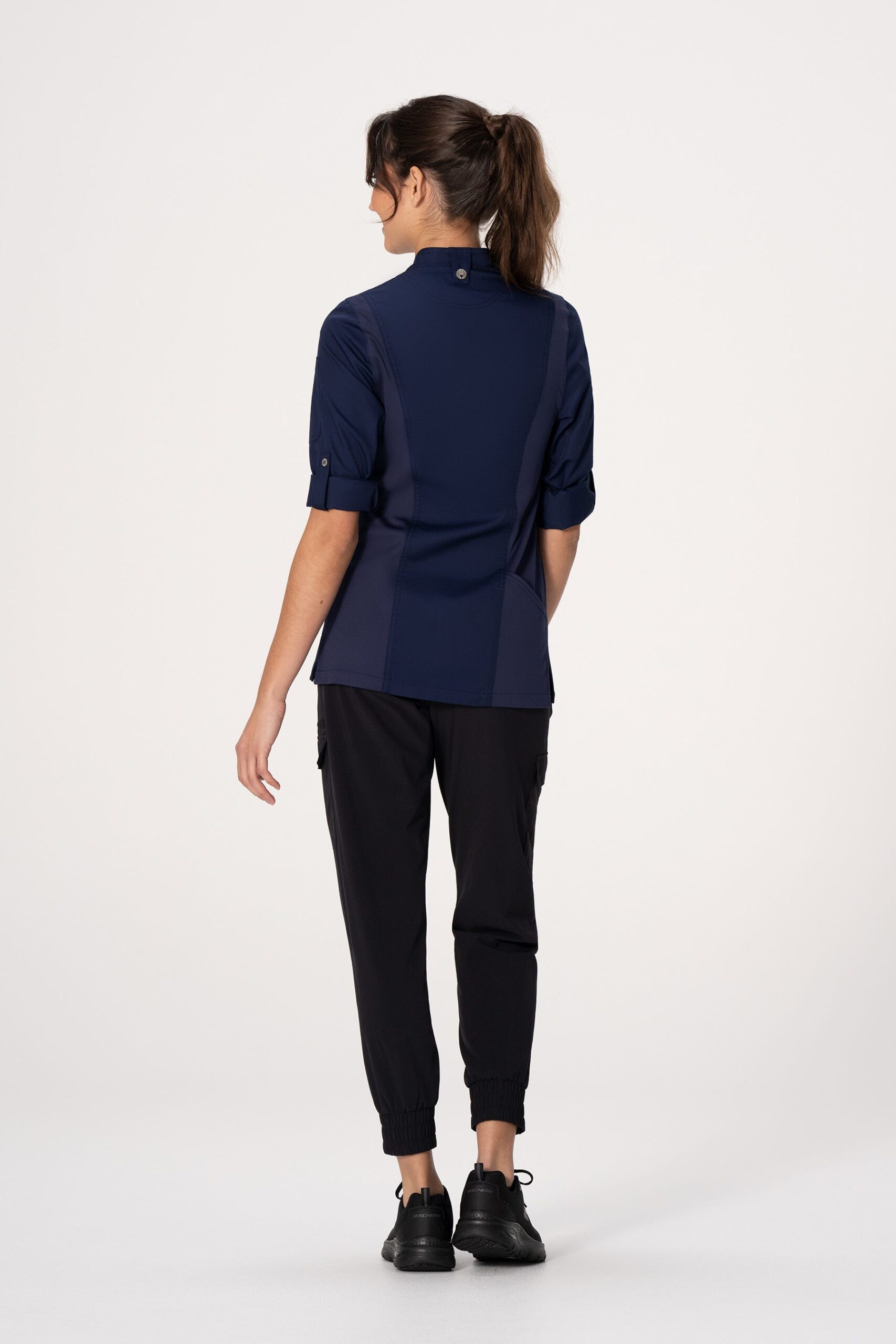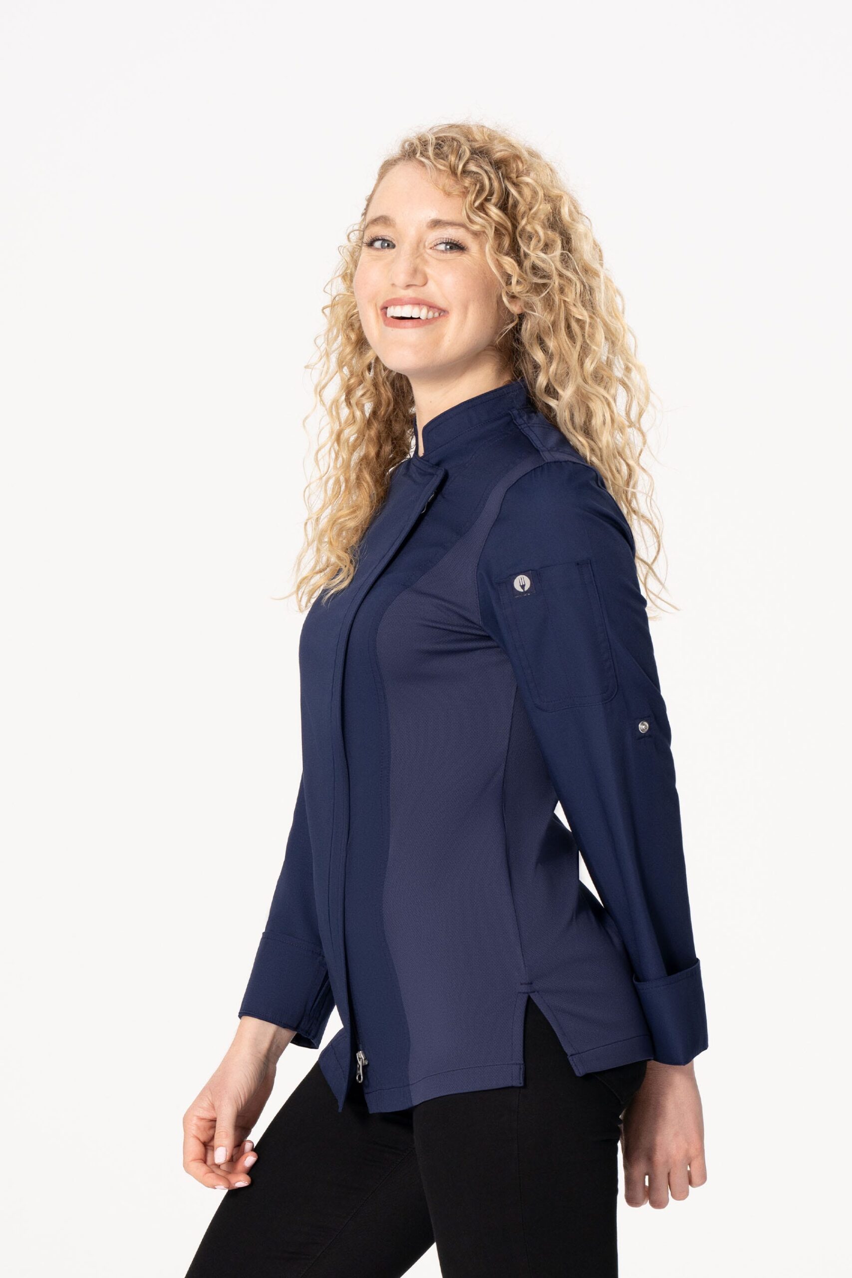 Deze dames koksbuis is gemaakt met Cool Vent™ side panels with side-seam slits. Roll-up long sleeves with snap tab. Single-breasted with zipper closure